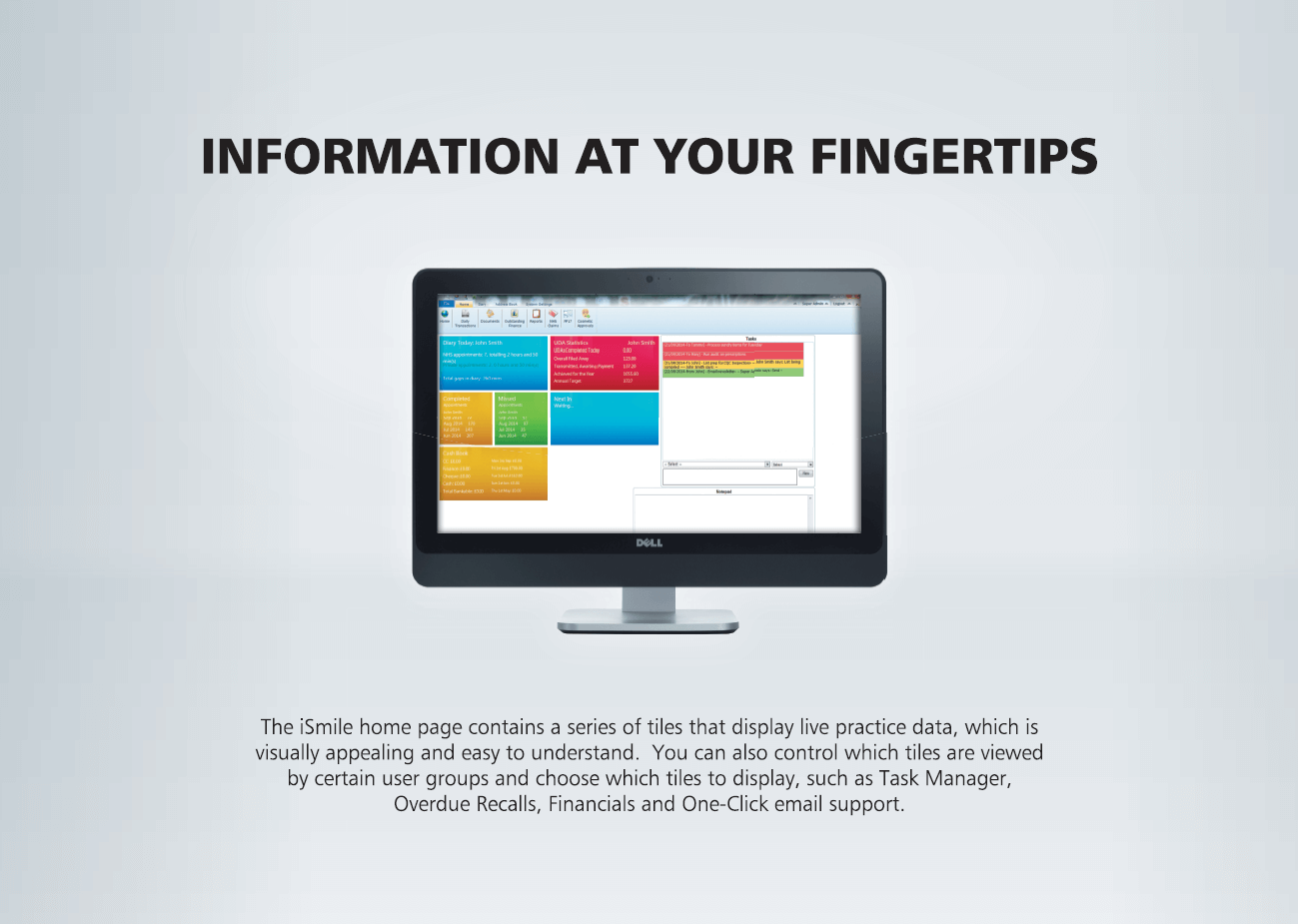 iSmile has a vast array of management tools, which allow the user to manage staff and practice tasks efficiently. Daily revenue generated is displayed in a simple and clear format allowing the user to view sales, expenditure, net and bankable amounts.