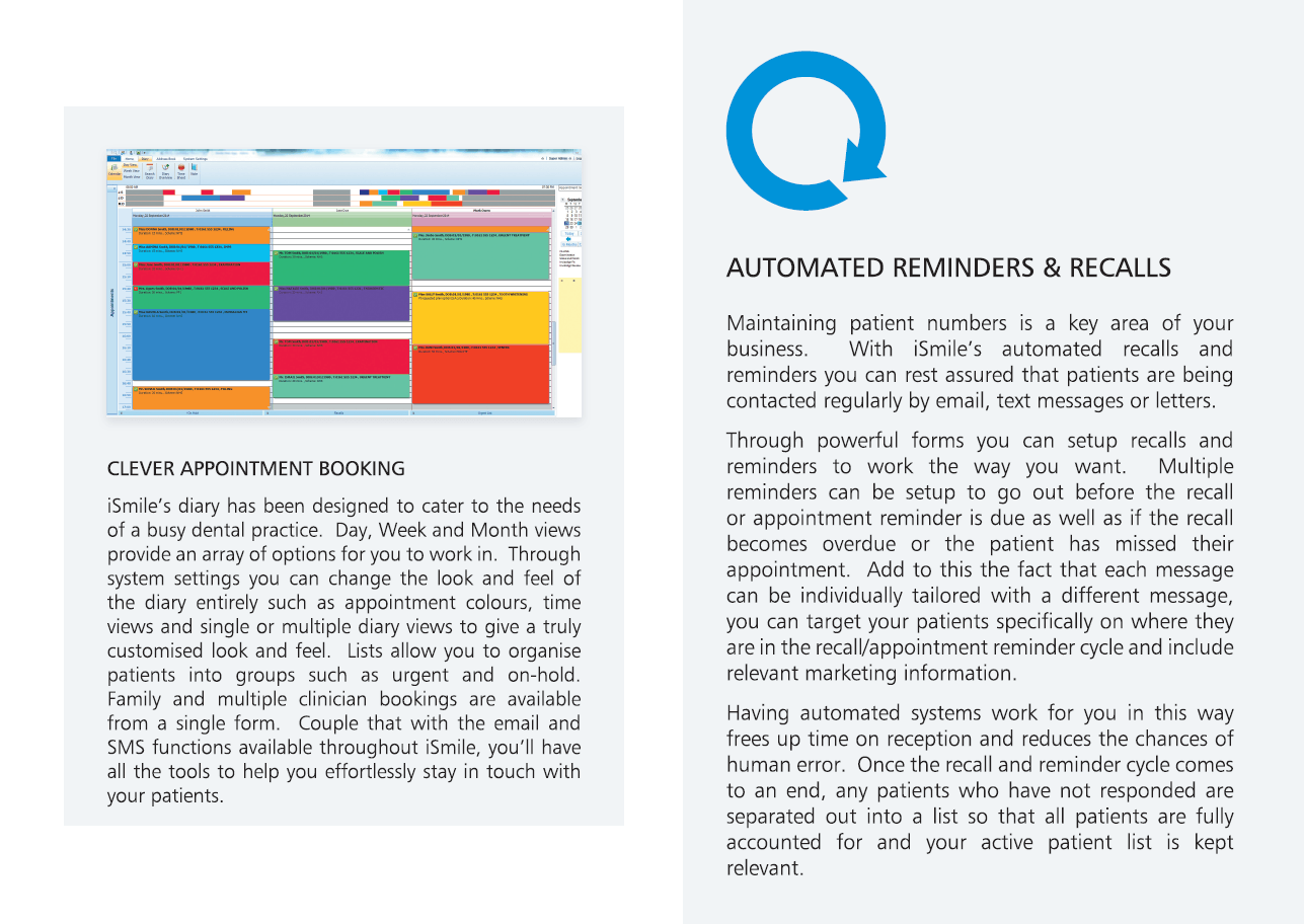 iSmile’s proprietary diary functions give users clear views on the day, week or month. A mini summary day view allows users to view their day at a glance and interacts with the main calendar for easy and quick navigation and allows the diary to automatically pick up information for patients who require appointments.